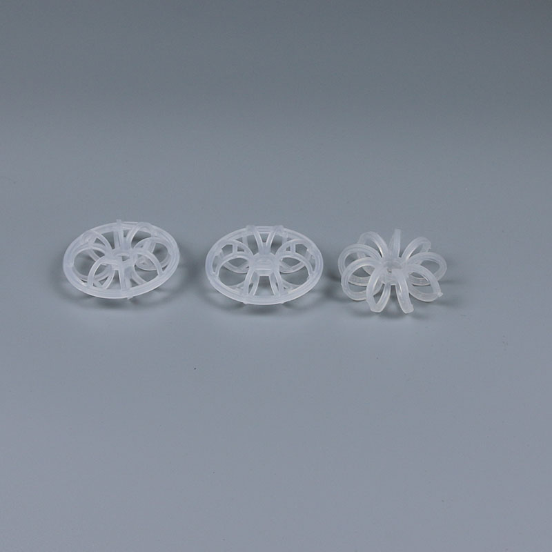 塑料花環(huán)填料最早是由美國A.J.Teller于1954年研制開發(fā)出來的,因此花環(huán)也經(jīng)常被稱為泰勒花環(huán)填料(Teller Rosette)。塑料花環(huán)填料用的最多是聚丙烯花環(huán)填料。塑料花環(huán)填料是由許多圓環(huán)結(jié)繞而成,由于填料的空隙處能有較高的持液量,可使塔內(nèi)液體的停留時(shí)間較長,從而增加了氣液兩相的接觸時(shí)間,提高了填料的傳質(zhì)效率?;ōh(huán)填料具有空隙率大,壓降和傳質(zhì)單元高度低,泛點(diǎn)高,汽液接觸充分,比重小,傳質(zhì)效率高等特點(diǎn),多用于氣體洗滌、凈化塔中。
